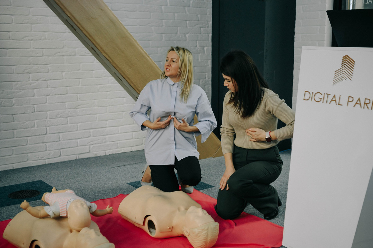 Exerciții practice pe manechin pentru însușirea manevrelor de prim ajutor.